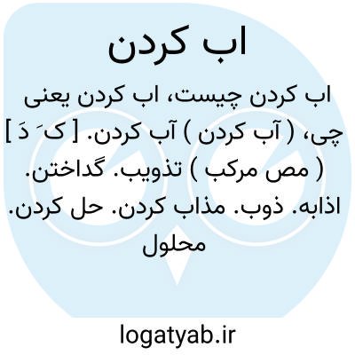 ( آب کردن ) ( مصدر ) ۱ - مایع ساختن تبدیل باب کردن ذوب کردن گداختن: آب کردن روغن آب کردن فلز. ۲ - ریختن آب در ظرف حوض و غیره. ۳ - جنس نامرغوب را فروختن ( مخصوصا بانواع حیله ). یا آب کردن دختر. بشوهر دادن او بحر نحو که میسر باشد. یا دل کسی را آب کردن. او را در مطلوب و آرزویی منتظر کردن.