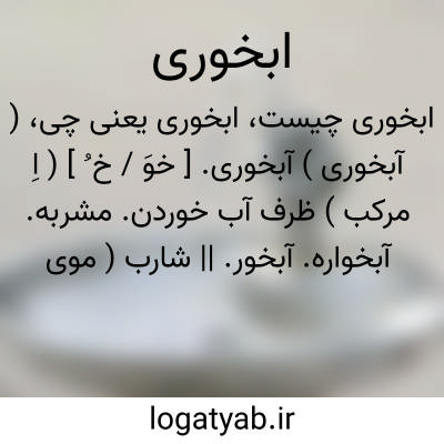 ( آبخوری ) ( اسم ) ۱ - ظرفی فلزین یا بلورین که با آن آب خورند آبخوره. ۲- آبخور آبشخور. ۳ - شارب موی سبلت موی سبیل. ۴ - نوعی از دهن. اسب که هنگام آب دادن بر دهانش زنند.