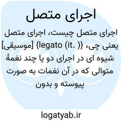 {legato (it. )} [موسیقی] شیوه ای در اجرای دو یا چند نغمۀ متوالی که در آن نغمات به صورت پیوسته و بدون انقطاع شنیده می شوند متـ. متصل 2