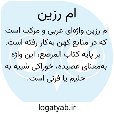 ام رزین. [ اُم ْ م ِ رَ ] ( ع اِ مرکب ) عصیده. ( از المرصع ). چنین است در المرصع. در اقرب الموارد ابو رزین آمده به معنی خبیص که نوعی حلوا است.