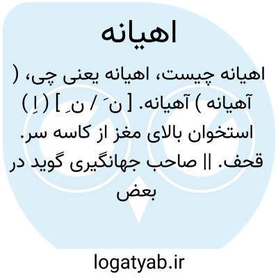 اهیانه. [ اَهَْ ن َ / ن ِ ] ( اِ ) مخفف آهیانه است که شقیقه و کاسه سر و دماغ و حلقوم باشد. ( برهان ) ( انجمن آراء ناصری )( آنندراج ). بمعنی آهیانه یعنی کاسه سر است و در فرهنگ جهانگیری به معنی شقیقه است و در بعضی فرهنگها به معنی نای حلقوم مذکور است. ( شعوری ). کاسه سر و قیل نزدیک حلقوم که آنرا حلقوم نیز گویند به تازیش حنک خوانند. ( شرفنامه منیری ). و رجوع به آهیانه شود.