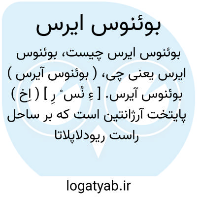 ( بوئنوس آیرس ) بوئنوس آیرس. [ ءِ نُس ْ رِ ] ( اِخ ) پایتخت آرژانتین است که بر ساحل راست ریودلاپلاتا قرار دارد و بزرگترین شهرهای نیمکره ٔجنوبی و سومین شهر نیمکره غربی، و بندر عمده و مرکز عمده مالی و صنعتی و اجتماعی آرژانتین است و 2982580 تن سکنه دارد. بزرگترین کارخانه های سردسازی گوشت در جهان در آنجا است. صنایع دیگرش نساجی و طبع و نشر است. کرسی ایالت بوئنوس آیرس، لاپلاتا است که از حیث دام و غلات ثروتمند است. ( از دائرة المعارف فارسی ).
