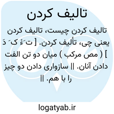 تألیف کردن. [ ت َءْ ک َ دَ ] ( مص مرکب ) میان دو تن الفت دادن آنان. || سازواری دادن دو چیز را با هم. || فراهم آوردن کتاب. گرد آوردن مسائل علمی. کتاب نوشتن. رجوع به تألیف شود.