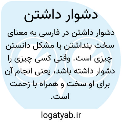 عبارت «دشوار داشتن» در فارسی به معنای سخت پنداشتن یا مشکل دانستن چیزی است. وقتی کسی چیزی را دشوار داشته باشد، یعنی انجام آن برای او سخت و همراه با زحمت است و احساس می‌کند که با سختی و مشکل همراه است.