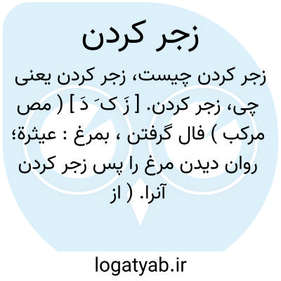 زجر کردن. [ زَ ک َ دَ ] ( مص مرکب ) فال گرفتن، بمرغ: عیثرة؛ روان دیدن مرغ را پس زجر کردن آنرا. ( از منتهی الارب ). || راندن شتر یا دیگر حیوانات و یا تاراندان سباع با بانگ، یا گفتن کلمه ای: بس بس؛ زجر کردن شتر در وقت راندن. ( تاج المصادر بیهقی ). قوس؛ کلمه ای است که بدان سگ را زجر کنند. ( منتهی الارب ). || سرزنش کردن. تنبیه. تأدیب: پسر را زجر و ملامت کردند که با پرورنده خویش بیوفایی کردی. ( گلستان ). استاد از زمینش بالای سر برد و فرو کوفت. ملک فرمود استاد را خلعت و نعمت دادن پس پسررا زجر و ملامت کردند. ( گلستان ). زجر و توبیخی که برکودکان دیگر کردی در حق وی روا نداشتی. ( گلستان ).