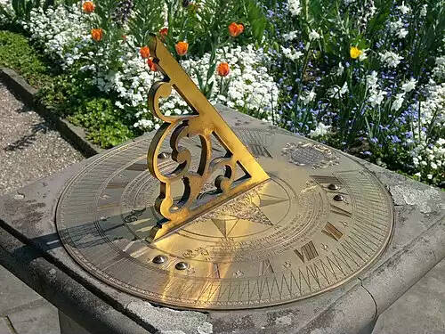 ساعت آفتابی. ساعت آفتابی وسیله ای است که زمان را با استفاده از مکان خورشید در آسمان می سنجد. معمول ترین نوع ساعت آفتابی از میله ای ساخته شده است که روی صفحه ای قرار دارد و ساعت های شبانه روز روی صفحه نشانه گذاری شده اند. وقتی مکان خورشید در آسمان عوض می شود، مکان سایهٔ میله هم روی صفحه جابه جا می شود و ساعت را نشان می دهد.