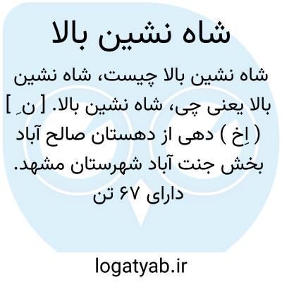 شاه نشین بالا. [ ن ِ ] ( اِخ ) دهی از دهستان صالح آباد بخش جنت آباد شهرستان مشهد. دارای 67 تن سکنه. آب آن از قنات. محصول آن غلات.ذرت و پنبه است. ( از فرهنگ جغرافیایی ایران ج 9 ).