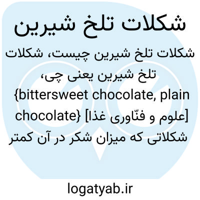 {bittersweet chocolate, plain chocolate} [علوم و فنّاوری غذا] شکلاتی که میزان شکر در آن کمتر از یک سوم کاکائوی آن است و مقدار زیادی کرۀ کاکائو دارد متـ. شکلات تیره dark chocolate, black chocolate