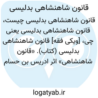[ویکی فقه] قانون شاهنشاهی بدلیسی (کتاب). «قانون شاهنشاهی» اثر ادریس بن حسام الدین بدلیسی (متوفی ۹۲۶ ق) از جمله ذخایر گران بهای نثر بلیغ فارسی و یکی از مظاهر درخشان اندیشه، فرهنگ و ادب ایرانی، در موضوع اخلاق کشورداری است که توسط عبدالله مسعودی آرانی تصحیح شده است.