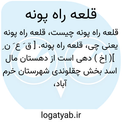 قلعه راه پونه. [ ق َ ع َ ن ِ ]( اِخ ) دهی است از دهستان مال اسد بخش چقلوندی شهرستان خرم آباد، واقع در 6هزارگزی جنوب خاوری چقلوندی و 6هزارگزی جنوب خاوری اتومبیل رو خرم آباد به چقلوندی. موقع جغرافیایی آن کوهستانی و سردسیری مالاریائی است. سکنه آن 240 تن است. آب آن از چشمه ها و محصول آن غلات، صیفی، لبنیات و شغل اهالی زراعت و گله داری و صنایع دستی زنان فرش و سیاه چادر و طناب بافی است. راه مالرو دارد. ساکنین از طایفه مال اسد هستند و در زمستان به قشلاق میروند. ( از فرهنگ جغرافیایی ایران ج 6 ).
