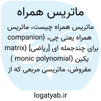 {companion matrix} [ریاضی] برای چندجمله ای یکین (monic polynomial ) مفروض، ماتریسی مربعی که از قرار دادن قرینۀ ضرایب آن چندجمله ای به ترتیب صعودی درجه در آخرین سطر ماتریس زبرقطری یکه به دست می آید