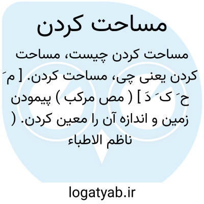 مساحت کردن. [ م َ ح َ ک َ دَ ] ( مص مرکب ) پیمودن زمین و اندازه آن را معین کردن. ( ناظم الاطباء ). اندازه گرفتن. وسعت سطحی را تعیین کردن. حزر. ( دهار ): چون خواهند که زمینی را مساحت کنند اولاً طول آن باز بینند که چند باب است و باب... عبارت از شش گز است، آنچه حاصل شوداز بابها هر ده را اشل گیرد و آنچه کم از ده باشد بر حال خود بگذارند گویند اشلی و چند باب، و آنچه کم از شش باشد نسبت دهند آن را با باب و گویند نصف باب چون سه گز باشد و ثلث باب چون دو گز باشد، بعد از آن عرض را بپیمایند بدین نوع که یاد کردیم پس ابواب طول در ابواب عرض بزنند آنچه حاصل شود به هر باب عشیری حساب کند و هر ده عشیری قفیزی و هر ده قفیزی جریبی و هر چه کم از شش باشد بر حال بگذارد و همچنین هر چه کم از شش گز بود؛ مثلاً گویند این زمین چند جریب و چند قفیز و چند عشیر و چند باب و ثلث یا نصف یا سدس باب است. ( تاریخ قم ص 109 و 110 ). فلج؛ زمین مساحت کردن. ( دهار ). مسیح؛ آنکه زمین را مساحت کند. ( دهار ).