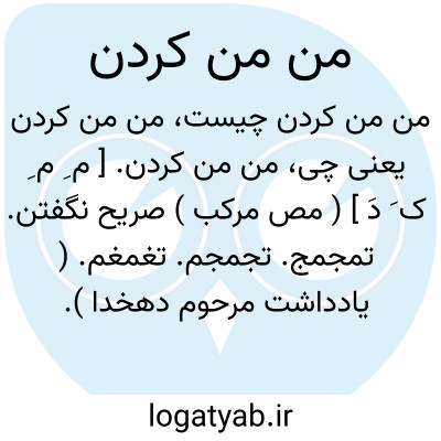 من من کردن. [ م ِ م ِ ک َ دَ ] ( مص مرکب ) صریح نگفتن. تمجمج. تجمجم. تغمغم. ( یادداشت مرحوم دهخدا ). منگ منگ کردن. جویده جویده و نوعی تودماغی حرف زدن. کلمات را جویده جویده و به صدای آهسته و به صورتی نامفهوم ادا کردن. ( فرهنگ لغات عامیانه جمال زاده ). بریده و نامفهوم و آمیخته با تردید سخن گفتن به سبب ترس یا شرم یا عدم اطلاع.