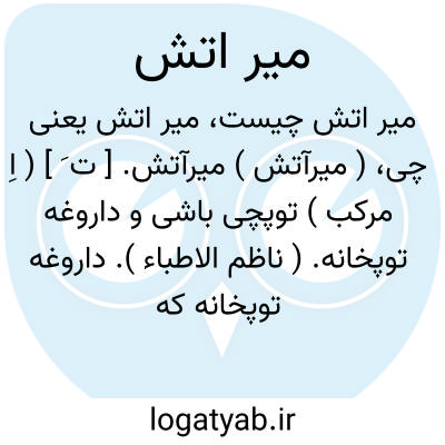 ( میرآتش ) میرآتش. [ ت َ ] ( اِ مرکب ) توپچی باشی و داروغه توپخانه. ( ناظم الاطباء ). داروغه توپخانه که قزلباش آن را توپچی باشی خوانند. ( آنندراج ). داروغه توپخانه. ( غیاث ):