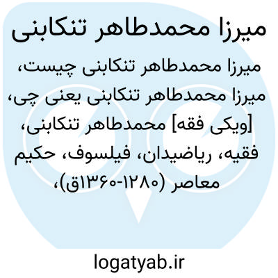 [ویکی فقه] محمدطاهر تنکابنی، فقیه، ریاضیدان، فیلسوف، حکیم معاصر (۱۲۸۰-۱۳۶۰ق)، از رجال سیاسی ایران در دوره پهلوی و از اولین نمایندگان مجلس تهران بود. میراز محمدطاهر در ادبیات و طب قدیم هم صاحب نظر بود.