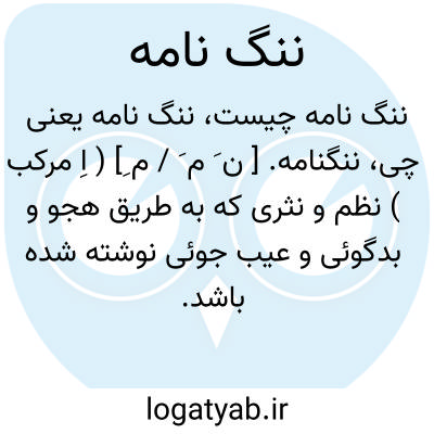 ننگنامه. [ ن َ م َ / م ِ] ( اِ مرکب ) نظم و نثری که به طریق هجو و بدگوئی و عیب جوئی نوشته شده باشد. ( از برهان قاطع ) ( آنندراج ) ( از ناظم الاطباء ). رجوع به ننگ و نامه شود. || جنگ نامه. ( انجمن آرا ) ( برهان قاطع ) ( آنندراج ) ( ناظم الاطباء ). رجوع به ننگ و نیز رجوع به «ننگ و نبرد» و ترکیب ِ «روز ننگ و نام » ذیل «ننگ و نام » شود.