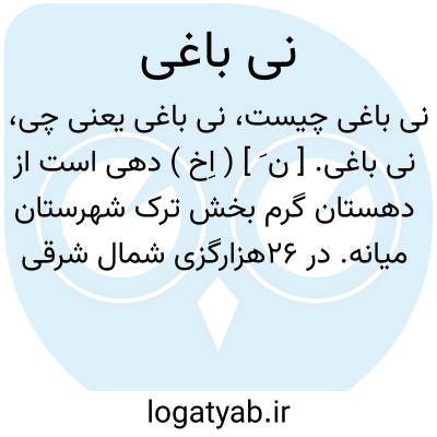 نی باغی. [ ن َ ] ( اِخ ) دهی است از دهستان گرم بخش ترک شهرستان میانه. در 26هزارگزی شمال شرقی ترک و 26هزارگزی راه میانه به خلخال. در منطقه کوهستانی معتدل هوایی واقع است و 519 تن سکنه دارد. آبش از چشمه و کوه، محصولش غلات و حبوبات، شغل اهالی زراعت و گله داری است. ( از فرهنگ جغرافیائی ایران ج 4 ).