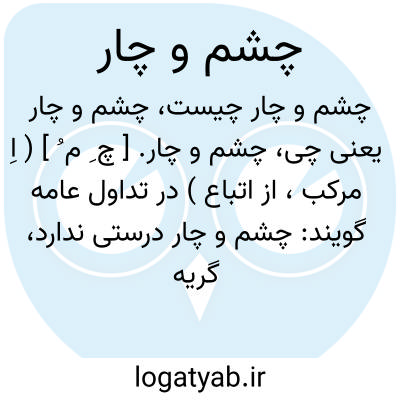 چشم و چار. [ چ ِ م ُ ] ( اِ مرکب، از اتباع ) در تداول عامه گویند: چشم و چار درستی ندارد، گریه با این چشم و چار تو متناسب نیست، چشم و چارش بهم ریخته است.