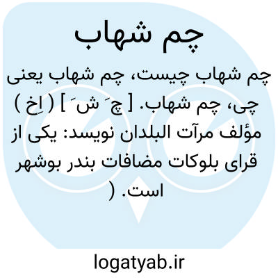 چم شهاب. [ چ َ ش َ ] ( اِخ ) مؤلف مرآت البلدان نویسد: یکی از قرای بلوکات مضافات بندر بوشهر است. ( از مرآت البلدان ج 4 ص 261 ). در فرهنگ جغرافیایی آمده است: دهی از دهستان حیات داود بخش گناوه شهرستان بوشهر که در 2 هزارگزی شمال گناوه واقع است. جلگه و گرمسیر است و 200 تن سکنه دارد. آبش از چاه. محصولش غلات و خرما. شغل اهالی زراعت و راهش اتومبیل رو است. ( از فرهنگ جغرافیایی ایران ج 7 ).