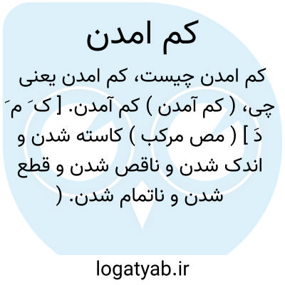 ( کم آمدن ) کم آمدن. [ ک َ م َ دَ ] ( مص مرکب ) کاسته شدن و اندک شدن و ناقص شدن و قطع شدن و ناتمام شدن. ( ناظم الاطباء ). اندک بودن. ناقص شدن. ناتمام بودن. ( فرهنگ فارسی معین ). از شماره چیزی کاسته شدن. نرسیدن به حدی که بایسته است. کافی نبودن. کفاف ندادن: