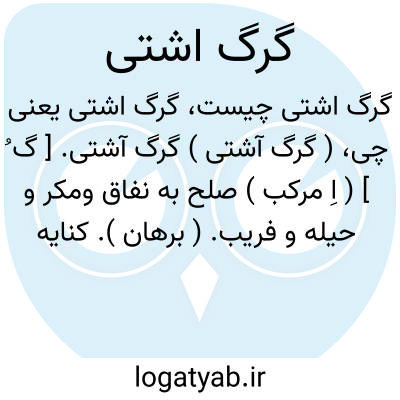 ( گرگ آشتی ) ( اسم ) آشتی ظاهری که در باطن دلهای طرفین بر دشمنی باقی باشد صلح بنفاق و مکر و فریب: قورچی باشی که مرد خیر اندیشی بود در مقام اصلاح در آمده میان. ایشان گرگ آشتی واقع شد.