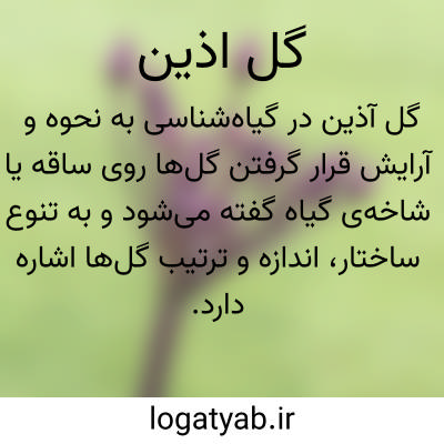 ( گل آذین ) ( اسم ) طرز قرار گرفتن و شیو. آرایش مجموع. گلها بر روی دم گل اصلی یک گیاه آرایش گل. یا گل آذین چتری. گل آذینی است نامحدود که دم گلهای فرعی آن از یک نقط. دم گل مشترک جدا میشود و برگک های آن حلقه ای بنام گریبان میسازند مانند گل آذین حویج ( گزر ) و جعفری. یا گل آذین خوشه یی. گل آذینی است نامحدود که دم گل اصلی آن به دم گلهای فرعی کوتاه تری تقسیم میشود و گلها بر روی دم گلهای کوتاهتر فرعی قرار دارند مانند گل آذین شب بو و انگور. یا گل آذین دیهیم.گل آذینی است نامحدود و شبیه گل آذین خوشه یی که گلهای آن تقریبا همه در یک سطح قرار دارند مانند گل آذین گلابی و گیلاس. یا گل آذین سنبله. گل آذینی است نا محدود که گلهای آن فاقد پایک فرعی هستند و بر روی دم گل اصلی از پایین ببالا واقعند مانند گل آذین بارهنگ و گندم. یا گل کلاپرک. گل آذینی است نامحدود که گلهای آن بر روی طبقی بنام نهنج قرار دارند و این نهنج ممکنست صاف ویا بر آمده باشد مانند گل آذین آفتاب گردان و بابونه. هر گل این گونه گل آذین معمولا بنام گلچه خوانده میشود مرکب کاپیتول. یا گل آذین گرزن. گل آذینی را گویند که ساق. گل دهنده و پایکها و بالاخره هر یک از پایکهای فرعی بیک گل منتهی شوند. این گلها از طرفی رشد و نمو انتهایی ساقه را متوقف میسازند و از طرف دیگر در تولید انشعابات فرعی آن موثرند گل آذین محدود. یا گل آذین محدود. گل آذین گرزن. یا گل آذین نامحدود. گل آذینی را گویند که ساق. گل دهند. آن بطور نامحدود میتواند برشد و نمو خود ادامه دهد و غنچه های جدیدی را بوجود آورد. این گل آذین دارای اقسام مختلف است که اهم آنها عبارتند از: خوشه یی سنبله دیهیم چتری کلاپرک.