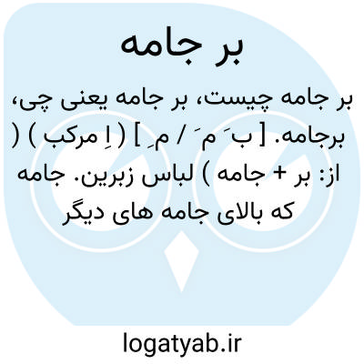 برجامه. [ ب َ م َ / م ِ ] ( اِ مرکب ) ( از: بر + جامه ) لباس زبرین. جامه که بالای جامه های دیگر پوشند. مقابل شعار. دثار. || جامه برسا. لباس رو. || لباس پربهای باشکوه. ( ناظم الاطباء ).