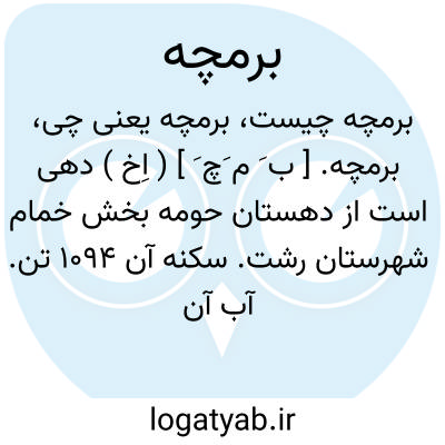 برمچه. [ ب َ م َچ َ ] ( اِخ ) دهی است از دهستان حومه بخش خمام شهرستان رشت. سکنه آن 1094 تن. آب آن از خمام رود از منشعبات سفیدرود و محصول آن برنج، ابریشم، توتون سیگار، صیفی و لبنیات است. ( از فرهنگجغرافیایی ایران ج 2 ).