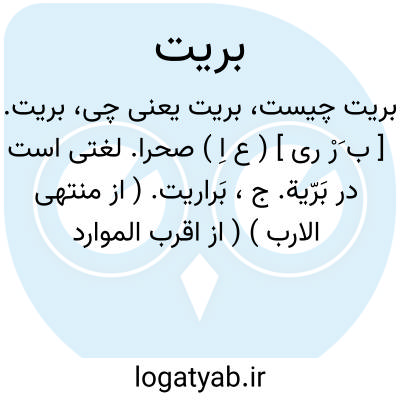بریت. [ ب ِرْ ری ] ( ع ص، اِ ) دلیل ماهر. || زمین هموار. ( منتهی الارب ). || ( اِخ ) نام دوموضع در بصره. ( منتهی الارب ) ( از مراصد ). خریت و بریت دو سرزمینند در ناحیه بصره. ( از معجم البلدان ).