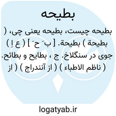( بطیحة ) بطیحة. [ ب َ ح َ ] ( ع اِ ) جوی در سنگلاخ. ج، بطایح و بطائح. ( ناظم الاطباء ) ( از آنندراج ) ( از منتهی الارب ). بطیحه، بطحاء. ( منتهی الارب ). جای جمع شدن آب. رجوع به این کلمات در جای خود شود: رود طبیعی آن است که آبهایی بود بزرگ... و همی رود تا بدریایی رسد یا به بطیحه ای.( حدود العالم ). بود که از یک رود طبیعی رودهای بسیار بردارد و بکار شود و آن عمود رود همی رود تا بدریارسد یا به بطیحه ای چون فرات. ( حدود العالم ). و با او منجمی بود، کیخسرو را گفت که ای ملک زود باشد که بدین بطیحه یعنی جای جمع شدن آب بنایی و عمارتی پیدا شود و این آب بدین موضع باز خوشد. ( تاریخ قم ص 61 ).