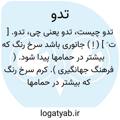 تدو. [ ت َ ] ( اِ ) جانوری باشد سرخ رنگ که بیشتر در حمامها پیدا شود. ( فرهنگ جهانگیری ). کرم سرخ رنگ که بیشتر در حمامها باشد. ( فرهنگ رشیدی ). جانوری است سرخ رنگ و پردار که اغلب در حمامهامیباشد و آنرا بعربی ابن وردان گویند. ( انجمن آرا ) ( آنندراج ). سوسک قرمز که بیشتر در حمامها پیدا شود. ( فرهنگ نظام ). جانوری که در حمامها متکون شود، و تاتونیز گویند. ( ناظم الاطباء ). || نام مرغی است صحرایی شبیه بخروس در نهایت خوشرویی و خوشرفتاری.( برهان ). تذرو. ( ناظم الاطباء ). رجوع به تذرو شود.