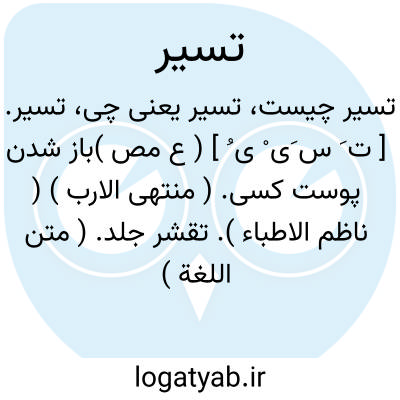 تسیر. [ ت َ س َی ْ ی ُ ] ( ع مص )باز شدن پوست کسی. ( منتهی الارب ) ( ناظم الاطباء ). تقشر جلد. ( متن اللغة ) ( اقرب الموارد ) ( المنجد ). || به روش کسی رفتن. ( منتهی الارب ) ( ناظم الاطباء ). || سیر کردن. ( غیاث اللغات ) ( آنندراج ).