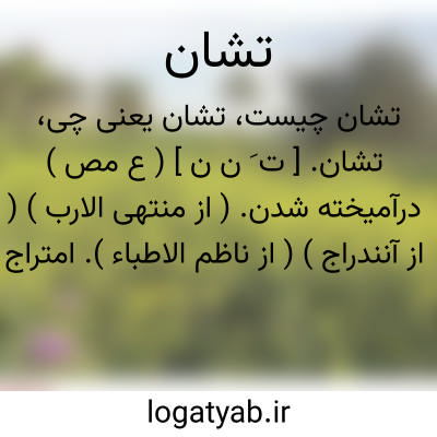 تشان. [ ت َ ن ن ] ( ع مص ) درآمیخته شدن. ( از منتهی الارب ) ( از آنندراج ) ( از ناظم الاطباء ). امتراج دو چیز. ( از متن اللغة ) ( از اقرب الموارد ) ( از المنجد ). || کهنه گردیدن مشک. ( منتهی الارب ) ( آنندراج ) ( ناظم الاطباء ) ( از متن اللغة ). || درکشیده شدن. || خشک شدن پوست.( منتهی الارب ) ( آنندراج ) ( ناظم الاطباء ). خشک شدن و درکشیده شدن پوست بی آنکه کهنه باشد. ( از متن اللغة ).