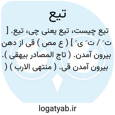 تیع. [ ت َ / ت َ ی َ ] ( ع مص ) قی از دهن بیرون آمدن. ( تاج المصادر بیهقی ). بیرون آمدن قی. ( منتهی الارب ) ( ناظم الاطباء ) ( از آنندراج ) ( از اقرب الموارد ). || روان شدن مایع. ( منتهی الارب ) ( ناظم الاطباء ) ( از اقرب الموارد ). || طی کردن راه. || شتافتن بسوی کسی و رفتن. || به پاره نان برداشتن روغن را.( منتهی الارب ) ( ناظم الاطباء ) ( آنندراج ) ( از ذیل اقرب الموارد ). || گرفتن چیزی را یا کسی را. ( منتهی الارب ) ( ناظم الاطباء ) ( از ذیل اقرب الموارد ).
