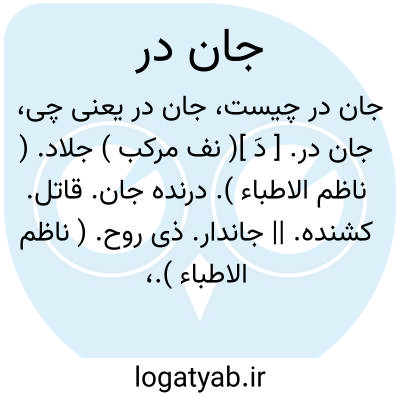 جان در. [ دَ ]( نف مرکب ) جلاد. ( ناظم الاطباء ). درنده جان. قاتل. کشنده. || جاندار. ذی روح. ( ناظم الاطباء ).، جاندر. [ رُ ] ( اِخ ) از اسامی عطارد در هندی قدیم. ( تحقیق ماللهند ص 105 س 8 ). || نام یکی از کتب نحوی و ادبی براهمه. ( تحقیق ماللهند ص 65 س 7 ).