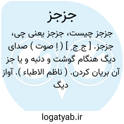 جزجز. [ ج ِج ِ ] ( اِ صوت ) صدای دیگ هنگام گوشت و دنبه و یا جز آن بریان کردن. ( ناظم الاطباء ). آواز دیگ بهنگام بریان کردن گوشت. ( شرفنامه منیری ). بانگ سرخ شدن گوشت در روغن. آواز سوختن طعام در ته دیگ. آواز روغن گاه جوشیدن، یا سوختن. اسم صوت سوختن گوشت و جز آن در آتش یا در دیگ و غیره. بیشتر بانگ برشته شدن گوشت در روغن داغ. ( یادداشت مؤلف ). جِزْجَز. ( ناظم الاطباء ).