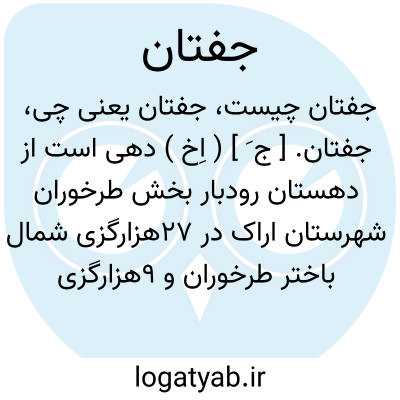 جفتان. [ ج َ ] ( اِخ ) دهی است از دهستان رودبار بخش طرخوران شهرستان اراک در 27هزارگزی شمال باختر طرخوران و 9هزارگزی راه مالرو عمومی. دامنه و معتدل است و 486 تن سکنه دارد.آب آن از قنات و محصول آن غلات و بنشن و انگور و بادام و پنبه و شغل اهالی زراعت و گله داری و قالیچه و جاجیم و گلیم بافی است. راه مالرو دارد و از نوبهار اتومبیل هم میرود. ( از فرهنگ جغرافیایی ایران ج 2 ).