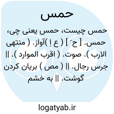حمس. [ ح َ ] ( ع اِ )آواز. ( منتهی الارب ). صوت. ( اقرب الموارد ). || جرس رجال. || ( مص ) بریان کردن گوشت. || به خشم آوردن. ( منتهی الارب ) ( اقرب الموارد ). || سخت و درشت گردیدن در دین. ( منتهی الارب ). || دلیر شدن. ( المصادر زوزنی ).