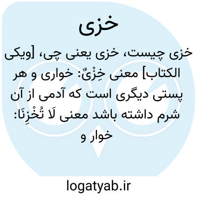 خواری. اصل آن ذلّتی است که شرمساری میآورد (اقرب) برای آنهاست در دنیا خواری مخصوص و در آخرت عذابی بزرگ. و نیز همان است که گاهی به لفظ هون آمده است مثل آیا با خواری و زبونی آن دختر را نگاه دارد یا در خاک مدفونش کند و مثل هر که خدا خوارش کند محترم دارندهای نخواهد داشت. خزی گاهی به معنی شرم آمده و مصدر آن خزایة (به کسر اوّل) است چنانکه در اقرب و مفردات تصریح کرده، در نهج البلاغه خطبه 104 آمده: «وَاحْشُرْنا فی زُمْرَتِهِ غَیْرَ خَزایا وَ لا نادِمین» خزایا جمع خزیان به معنی شرمنده و خجل است یعنی: ما را در زمره آن حضرت در حالیکه شرمنده و پشیمان نیستیم محشور فرما. ولی در قرآن مجید پیوسته به معنی خواری به کار رفته است و فقط در آیه مرا درباره میهمانم شرمنده و خجل نکنید آیا در میان شما مرد کاملی نیست؟ و نیز در آیه و در آیه شاید مراد از خزی عذاب و یا زبونی باشد که ناشی از عذاب است. افعال این مادّه در قرآن از ثلاثی مجرّد و باب افعال هر در به کار رفته است مثل و مثل و نیز اسم تفضیل و اسم فاعل آمده است نحو و نحو. و اینکه خزی را فضیحت و عذاب و عار و غیره گفتهاند همه آنها اسباب خزی و زبونیاند.