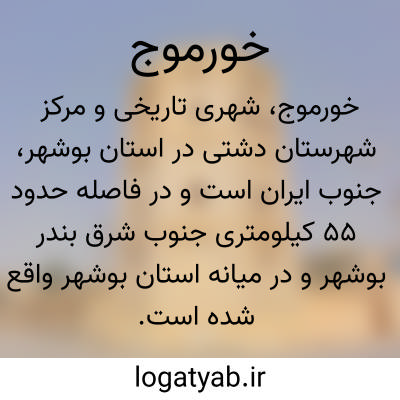 خورموج. [ خُرْ ] ( اِخ ) قصبه مرکزی بخش خورموج از شهرستان بوشهر است با مختصات جغرافیایی زیر: طول 51 درجه و 22 دقیقه و عرض 28 درجه و 39 دقیقه و ارتفاع آن از سطح دریا 55 متر. این قصبه در 82هزارگزی جنوب خاوری بوشهر و 28هزارگزی جنوب اهرم و 137هزارگزی شمال باختری کنگان کنار راه عمومی بوشهر به کنگان ( از راه کاکی ) واقع است. هوای آن گرم و آب مشروب آن از قنات و چاه است. سکنه این قصبه 2677 تن می باشد. شغل اهالی زراعت و پیله وری و صنعت دستی معمولاً عبابافی. در حدود 14 باب دکان و یک باب دبستان دارد. ادارات دولتی آن بخشداری، پست، ژاندارمری، بهداری، دخانیات، دارائی و آمار است. ( از فرهنگ جغرافیایی ایران ج 7 ).