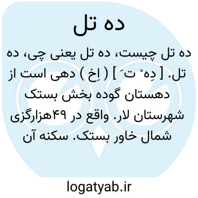 ده تل. [ دِه ْ ت َ ] ( اِخ ) دهی است از دهستان گوده بخش بستک شهرستان لار. واقع در 49هزارگزی شمال خاور بستک. سکنه آن 557 تن. آب آن از چاه و باران تأمین می شود. راه آن فرعی. ( از فرهنگ جغرافیایی ایران ج 7 ).