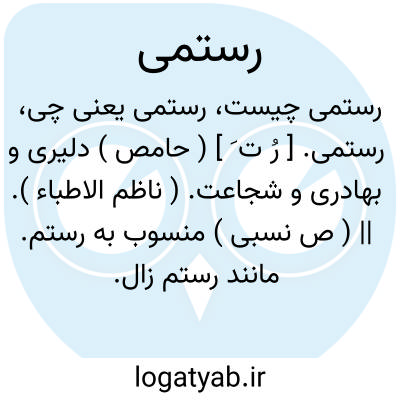 رستمی. [ رُ ت َ ] ( حامص ) دلیری و بهادری و شجاعت. ( ناظم الاطباء ). || ( ص نسبی ) منسوب به رستم. مانند رستم زال. رستمانه. ( یادداشت مؤلف ):
