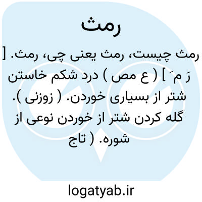 رمث. [ رَ م َ ] ( ع مص ) درد شکم خاستن شتر از بسیاری خوردن. ( زوزنی ). گله کردن شتر از خوردن نوعی از شوره. ( تاج المصادر بیهقی ). خوردن شتر شورگیاه را و رنجور شدن از وی. ( منتهی الارب ). رِمْث خوردن شتر و رنجور گردیدن از خوردن آن گیاه. ( از اقرب الموارد ). || آمیخته و شوریده شدن کار. ( از منتهی الارب ) ( آنندراج ). درهم و آشفته شدن کار. ( از اقرب الموارد ).