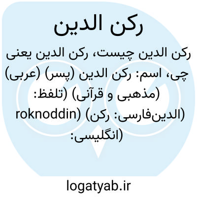معنی: پایه و اساس دین، ستون دین، ( اَعلام ) ) یوسف شاه دوم: ملقب به رکن الدین اتابک [، قمری]، ) رکن الدین خورشاه: آخرین رهبر [، قمری] اسماعیلیان الموت، که به هلاکوخان تسلیم شد و او را در راه مغولستان کشتند، ) رکن الدین سام: [قرن هجری] بنیانگذار سلسله ی اتابکان یزد، ) رکن الدین کرت: [، قمری] شاهی از سلسله ی آل کرت، که غور و قندهار را گشود، ) رکن الدین مبارک خواجه: امیر قراختایی کرمان [، قمری] پسر براق حاجب، که به دست جانشینش کشته شد