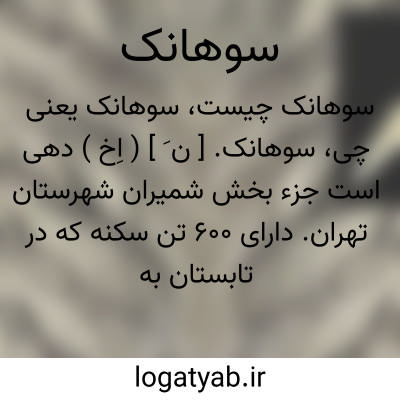 سوهانک. [ ن َ ] ( اِخ ) دهی است جزء بخش شمیران شهرستان تهران. دارای 600 تن سکنه که در تابستان به 1000 تن میرسد. آب آن از 4 رشته قنات. محصول آنجا غلات، بنشن، میوه جات، آلوزرد. مزرعه تنگه فاطمی، چال اسطلک، سوت بیشه، شنگ زار، باغ جهانبخش، تنگه آبخور، یوردکریم، بندطلحه هرز جزء این ده میباشد. در تابستان حدود 200 الی 400 نفر برای سکونت سه ماهه و استفاده از هوای خوب به این ده می آیند. مزرعه کوچک دره، بیدستان شاه پسند،تل گرگ که هر یک دو سه خانوار سکنه دارد، جزء این ده منظور شده است. ( از فرهنگ جغرافیائی ایران ج 1 ).