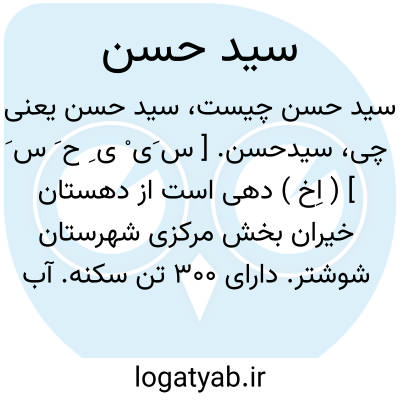سیدحسن. [ س َی ْ ی ِ ح َ س َ ] ( اِخ ) دهی است از دهستان خیران بخش مرکزی شهرستان شوشتر. دارای 300 تن سکنه. آب آن از کارون. محصول آنجا غلات. شغل اهالی زراعت و گله داری است. ( از فرهنگ جغرافیائی ایران ج 6 ).
