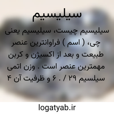 ( اسم ) فراوانترین عنصر طبیعت و بعد از اکسیژن و کربن مهمترین عنصر است. وزن اتمی سیلسیم ۲۹ /. ۶ و ظرفیت آن ۴ است. سیلسیم بی شکل گردیست گندم گون که به واسطه ذوب در ۱۵٠٠ درجه تبدیل به بلوری میشود. سیلسیم متبلور خاکستری فولادی و به صورت منشور با قاعده مسدس می باشد. وزن مخصوص آن ۲ / ۵ و کمی از سیلسیم بی شکل تر بیشتر است.