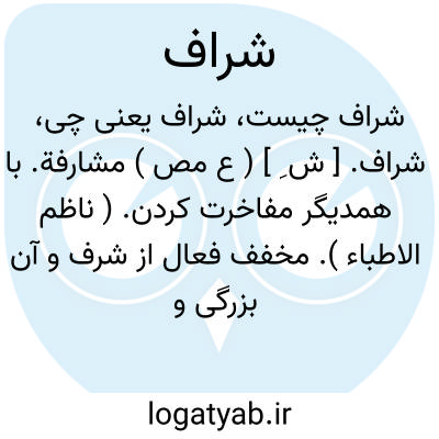 شراف. [ ش ِ ] ( ع مص ) مشارفة. با همدیگر مفاخرت کردن. ( ناظم الاطباء ). مخفف فعال از شرف و آن بزرگی و علو باشد. ( از معجم البلدان ). || برآمدن و مطلع شدن بر چیزی. ( ناظم الاطباء ). || نزدیک شدن. ( از ناظم الاطباء ).