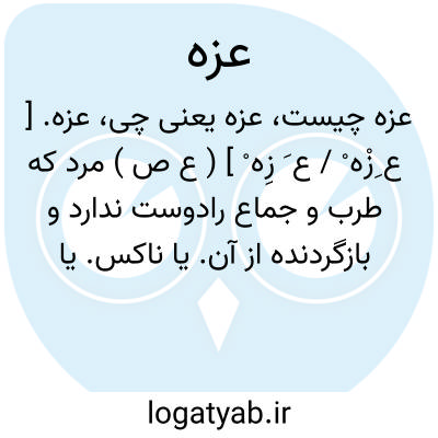 عزه. [ ع ِزْه ْ / ع َ زِه ْ ] ( ع ص ) مرد که طرب و جماع رادوست ندارد و بازگردنده از آن. یا ناکس. یا آن که نپوشد کینه صاحب خود را. ( منتهی الارب ): رجل عزه؛ مرد روی گردان از لهو و از زنان که از آنها بطرب نیاید و از آنها دوری جوید. و گویند شخص لئیم و پست. و گویندآنکه بغض و کینه دوست خود را کتمان نکند. ( از اقرب الموارد ). عِزهاء. عِزهاة. عزهی [ ع ِ ها / ع ِ هی ی ]. عُنزُهانی. عِنزَهو. عِنزَهوة. ج، عَزاه، عَزاهی، و عزِهون. ( اقرب الموارد ). و رجوع به عزهات شود.