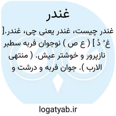 غندر. [ غ ُ دَ ] ( ع ص ) جوان فربه و درشت و نازپرورده، غلام سمین غلیظ ناعم. غُندُر. غَمَیذَر. ( از تاج العروس ) ( از اقرب الموارد ). || الحاح کننده در سؤال، چنانکه به مبرم و الحاح کننده گویند: یا غندر! رجوع به منتهی الارب، تاج العروس و غندر ( اِخ ) شود.